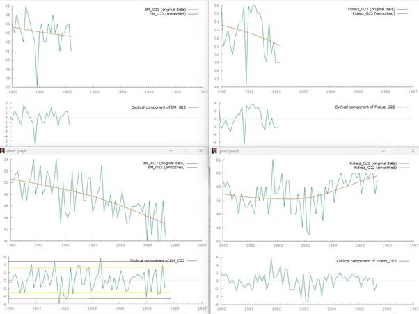 Az alábbi diagramok a szavazásokat, a lekérdezési trendet (HP-szűrő) és a ciklikus komponenst mutatják. Felül a Tisza (baloldali) és a Fidesz jobboldali ellenzéki közvélemény-kutatásai, alul pedig a kormányközeli felmérések. A kormányhoz igazodó közvélemény-kutatások rövidebbek, mert az ellenzéki közvélemény-kutatások sokkal többen vannak – az előző cikkben ezt „inflációnak” neveztem, mivel az összesített közvélemény-kutatási átlagokat az ellenzéki közvélemény-kutatások javára torzítja.