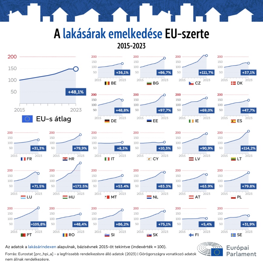 Az Eurostat Data szerint 2023 -ban a vidéki háztartások 7 % -a és a városi háztartások 10,6 % -a jövedelmük több mint 40 % -át költötte el a lakhatásra. Az EU -országokban a lakásárak átlagosan 48 % -kal emelkedtek 2015 és 2023 között, elsősorban a magasabb építési költségek, a megnövekedett kamatlábak, a csökkenő kínálat és a spekulatív ingatlanvásárlás eredményeként. Magyarországon ez a növekedés 173 % volt – a legmagasabb az EU -ban -, míg Finnországban csak 5 % volt, a legalacsonyabb szám. Az ingatlan -bérleti díjakat sem hagyták ki ebből a tendenciából, a 2010 és 2022 között 18 % -kal növekedett.