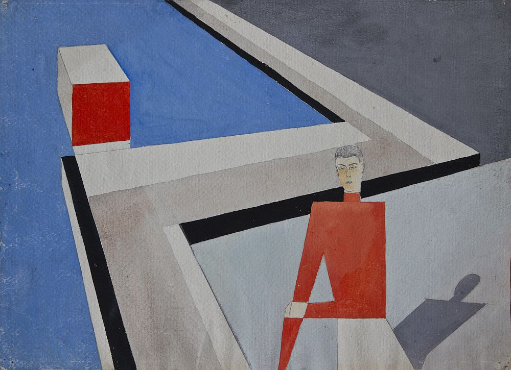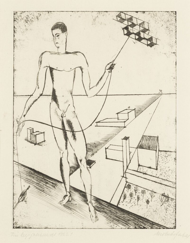 Az a munka, amely a kiállításnak ad címet, a legjobb példa erre az utópikus álmodozásra, amely ötvözi a hagyományt és a modernitást: egy karcsú, meztelen fiú repül repülõ játékát az égbe egy húron, néhány csapással, építőelemekkel és egy útba futó út a háttérben. Más művekben is felhasználta és változtatta ezeket a motívumokat (Meztelen építészet (Férfi hát meztelen villa tervvel és repülőgéppel), 1923; Két meztelen1923; Szerelmesek (Georg és El Muche a Haus AM kürtnél), 1923; Tanulmányterület, kaktuszos és repülőgépes ember1924). Még egyértelműbben játszik ezen a kettősségen a rajzban, amely azt mutatja, hogy egy robot egy fiatal nőt udvarol (Gépi ember (Egy mechanikus férfi elcsábít egy nőt), 1923).