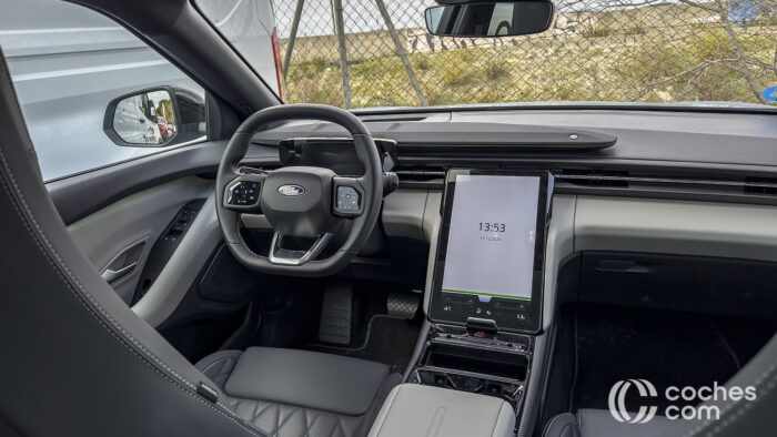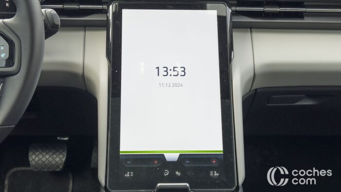 De a 14.6 -hüvelyk fő érintőképernyőamely a multimédiás rendszer neuralgikus központja kiemelkedőbb, mint a Volkswagen csoport modelljei. Az első dolog az, hogy függőleges elrendezéssel rendelkezik a tabletta stílusához, és hogy elfordulhat, lehetővé téve a felhasználó számára, hogy a dőlési szöget 30º -ig szabályozza. Ez nemcsak elősegíti a láthatóság javítását, hanem lehetővé teszi egy kis lyuk hagyását is, amely elrejthető, amikor elhagyjuk a járművet. Ezenkívül megvan a Szinkronizálni a multimédiás rendszert Ford, amely gyors és intuitív.