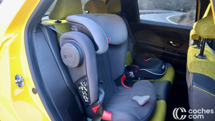 A hátsó ülésekben a Renault 5 E-Tech elfogadható helyet kínál a méretű autó számára. Elég két felnőtt számára, bár egy harmadik utas kissé szorosnak vagy közvetlenül nem megfelelőnek érezheti magát, ha – mint a mi esetünkben – két gyermekrés -széket kell elhelyeznie.