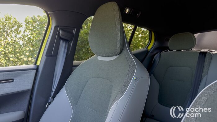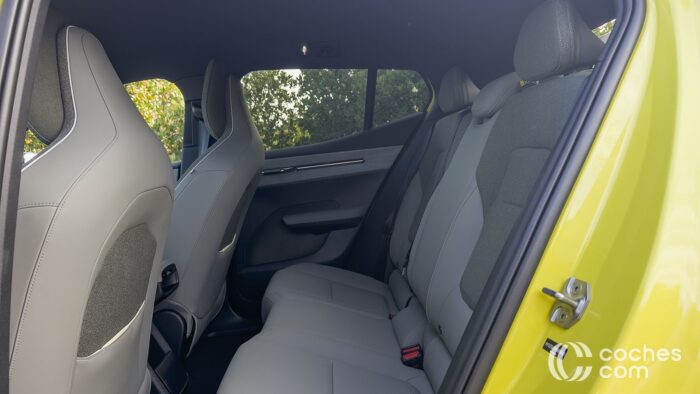 Amikor az Ex30 Volvo hátuljára megyünk Jó helyet látunk hogy tisztességes méretű jármű legyen. A lábterület több, mint helyes, és a fejét, nem a rakéták dobása, hanem azoknak a felhasználóknak felel meg, akik nem haladják meg az 1,85 métert. A Központi tér tisztességesebb és egy kis sebességváltó -alagútja van. Nincs légkondicionáló kimenet Ehhez a második sorhoz, és az ablakokat a központi rész egyes gombjain keresztül kell leengedni, nem az ajtóknál, ami kényelmetlenebb.